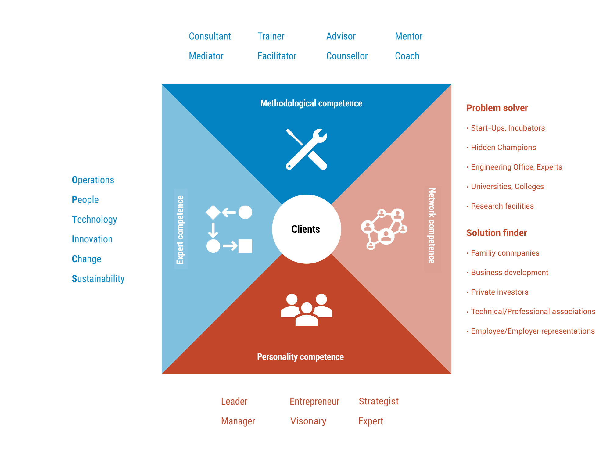 The key person is a complementary consultant who has comprehensive knowledge of facts & people and can skillfully vary between expert and process consulting in a kind of pendulum movement depending on the progress of the project.
